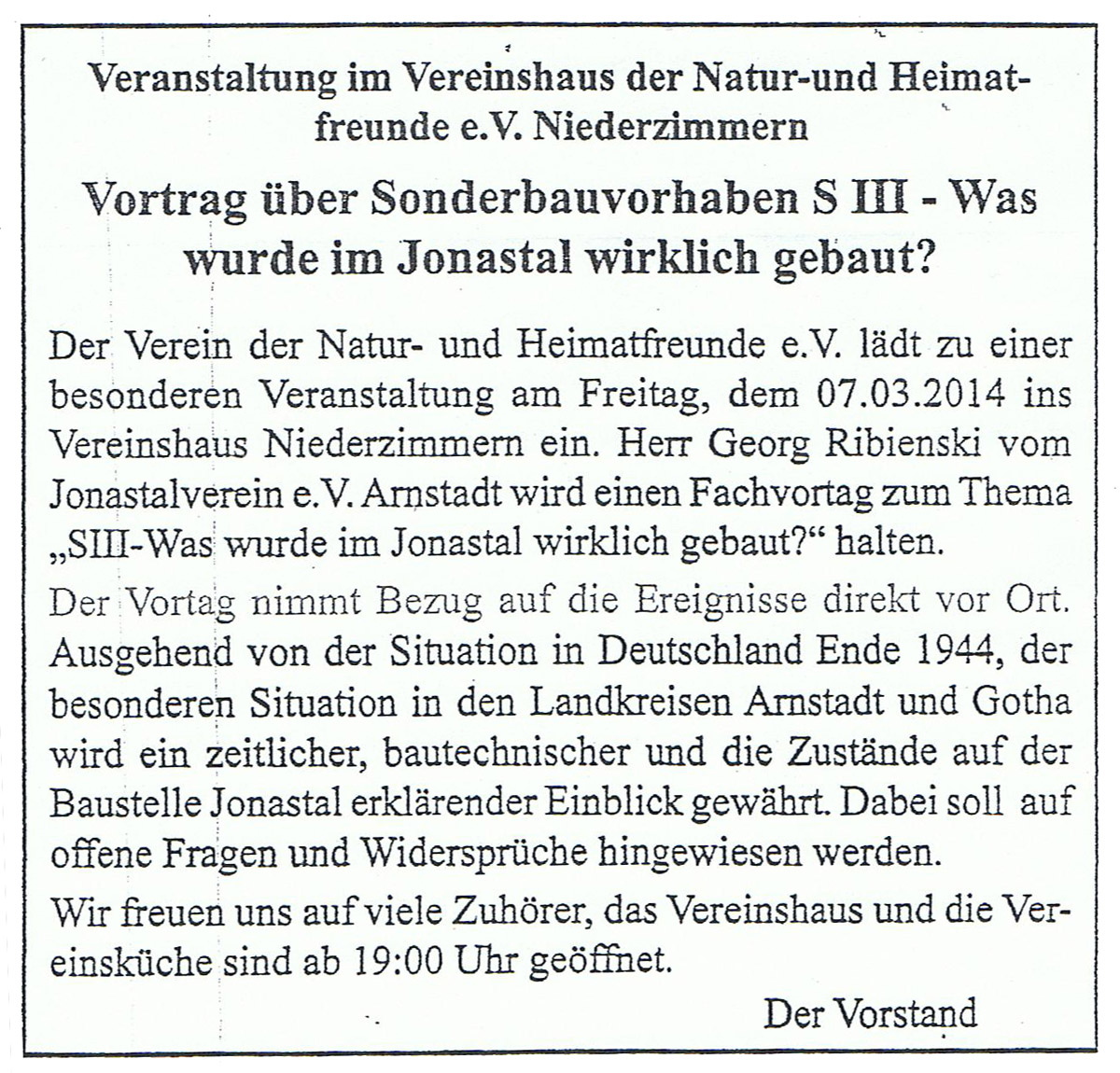 Zweiter Vortrag über Sonderbauvorhaben S III – Was bauten die Nazis im Jonastal wirklich? – diesmal am 07.03.2014 in Niederzimmern