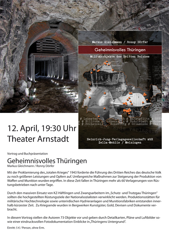 Am 12. April, 19:30 Uhr im Theater Arnstadt wird es einen Vortrag und die Buchpräsentation zur Neuvorstellung des Buches „Geheimnisvolles Thüringen“ von Markus Gleichmann / Ronny Dörfer geben.
