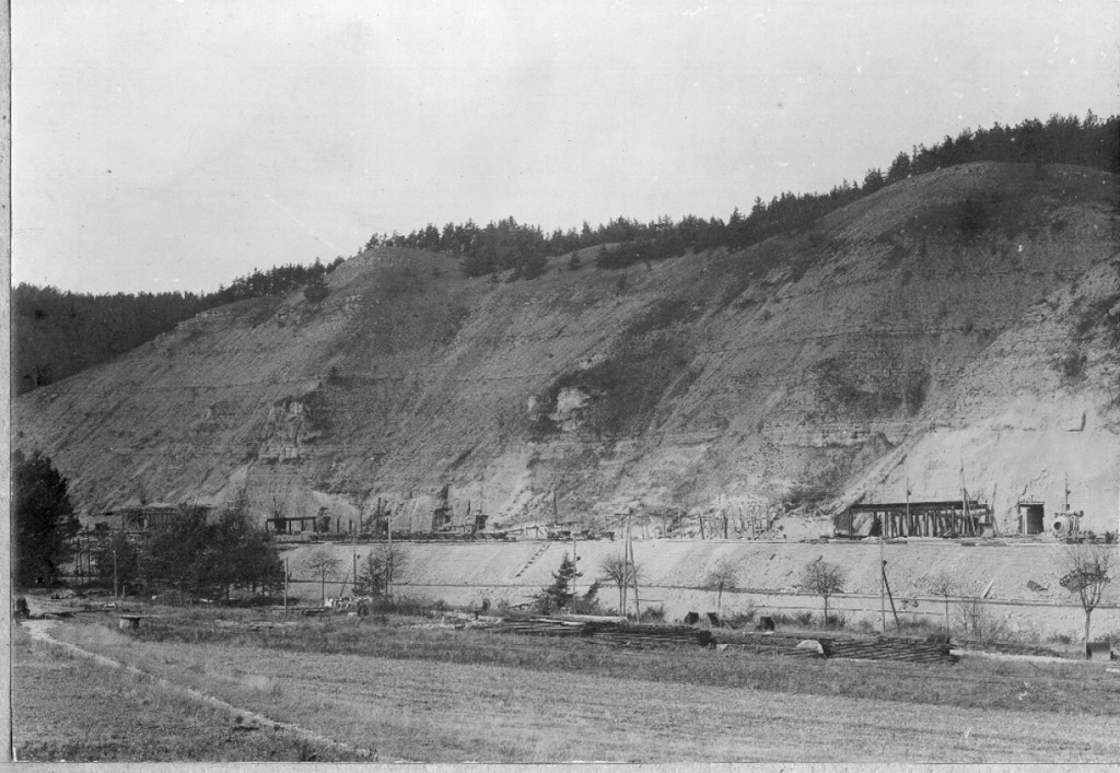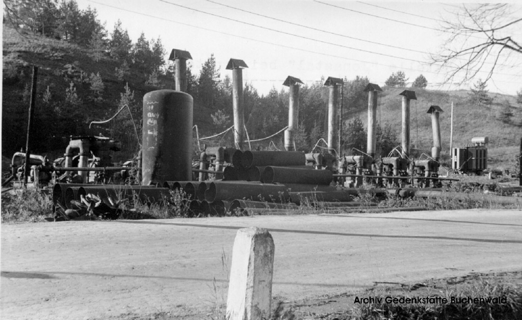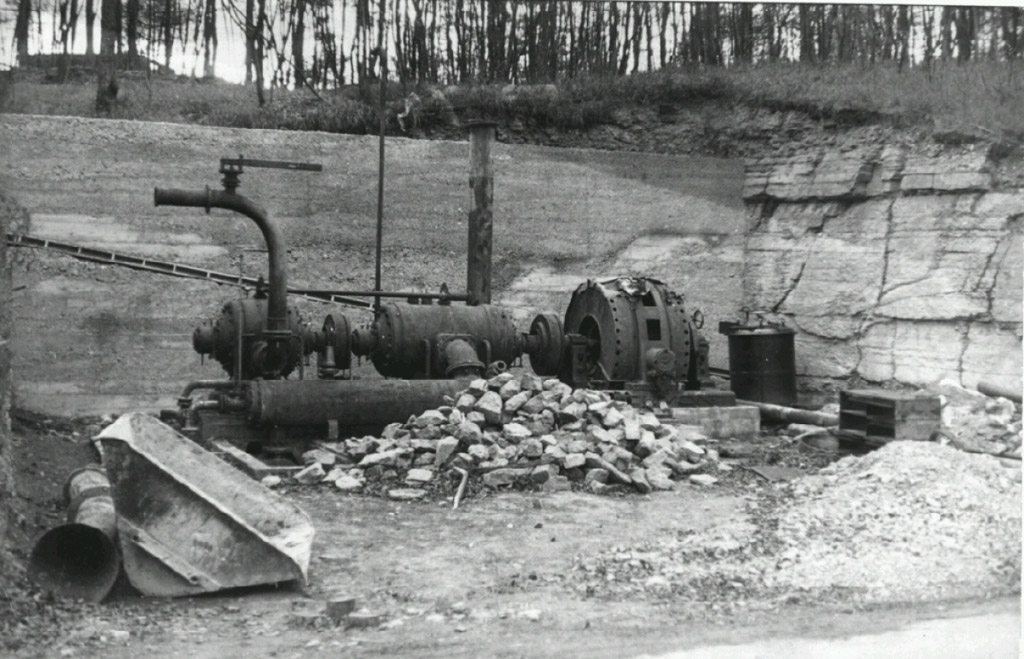 Längs der  Jonastalstraße befanden sich Materiallager, Kalkgruben, Baracken, die  Reparaturwerkstätten sowie maschinelle Anlagen, wie diese riesige Pumpe. Wahrscheinlich diente sie zur Brauchwasserversorgung der Baustelle oder als anfängliche Pressluftpumpe für die Bohrhämmer im Stollenbau.