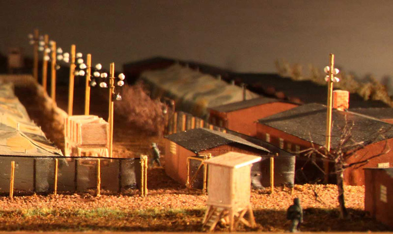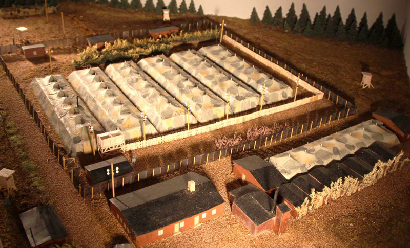 Hier zeigt ein weiteres Modell das Lager Espenfeld. Es hatte eine relativ kurze Geschichte, da es erst im Januar 1945 errichtet wurde. In dem ortsnah zum Jonastal aufgebauten Zeltlager waren etwa 1500 vor allem Russen, Polen und Tschechen untergebracht. Sie arbeiteten vorrangig an den Stollen und verlegten Versorgungsleitungen.