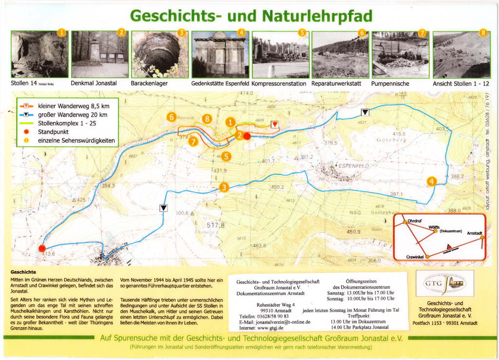 Wichtig ist natürlich auch die Darstellung der Geschehnisse vor Ort im Jonastal. Am 14. August wurde um 10 Uhr der neue Geschichts- und Naturlehrpfad im Jonastal eröffnet. Am Böhlersmännchenplatz, beginnt eine 7 km lange Rundwanderstrecke. Sie führt hier direkt an den Überresten der Stollenanlagen entlang. Die Sowjetarmee sprengte die Mundlöcher der Stollen. Das Ergebnis sind die zerklüfteten Muschelkalkhänge und Spalten, die das Betreten zu einer Lebensgefährlichen Aktion werden lassen. Auf kleinen Schautafeln gibt es Informationen zu den entsprechenden Relikten.